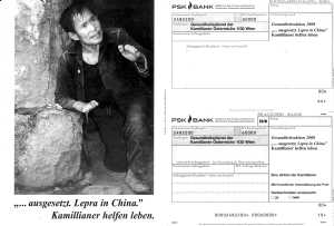Am 27. Jänner 2008 ist Weltlepratag. Die Kamillianer, die ihren Orden auf Kamillus von Lellis (1550-1614) zurückführen, kämpfen seit Jahrzehnten gegen die Lepra. Tausende Kranke konnten in ein menschenwürdiges Leben zurückkehren. Doch Tausende warten noch. Zum Beispiel in China. Wir bitten Sie um Hilfe für: