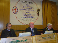 Anschließend hören wir das Referat vom spanischen Mitbruder, Br. José Carlos Bermejo, Doktor der Theologie in Krankenpastoral, Direktor des Ausbildungszentrums für Krankenpastoral in Madrid und Professor am Camillianum. Er behandelt das Thema: „Ordensleute und Laien - gemeinsam”. Das heißt: Er referiert über das Verhältnis zwischen uns, den Ordensangehörigen, und den Laien. Dabei stellt er kritische Fragen sowohl an uns als auch an die Laien, die eine Art „Gewissenserforschung” sein können und wollen. Zuerst stellt er „Diagnosen” an in Bezug auf unser Verhältnis zur „Welt der Laien”, zu den Laienmitarbeitern in unseren Werken und Arbeitsfeldern und zu den Mitgliedern der Kamillianischen Familien. Er gibt aber auch weiterführende Hilfsangebote („Therapien”) zur Verbesserung des Verhältnisses. Er tut es anhand des Bildes „Jesus der Arzt”. Als „Medikamente” schlägt er vor: